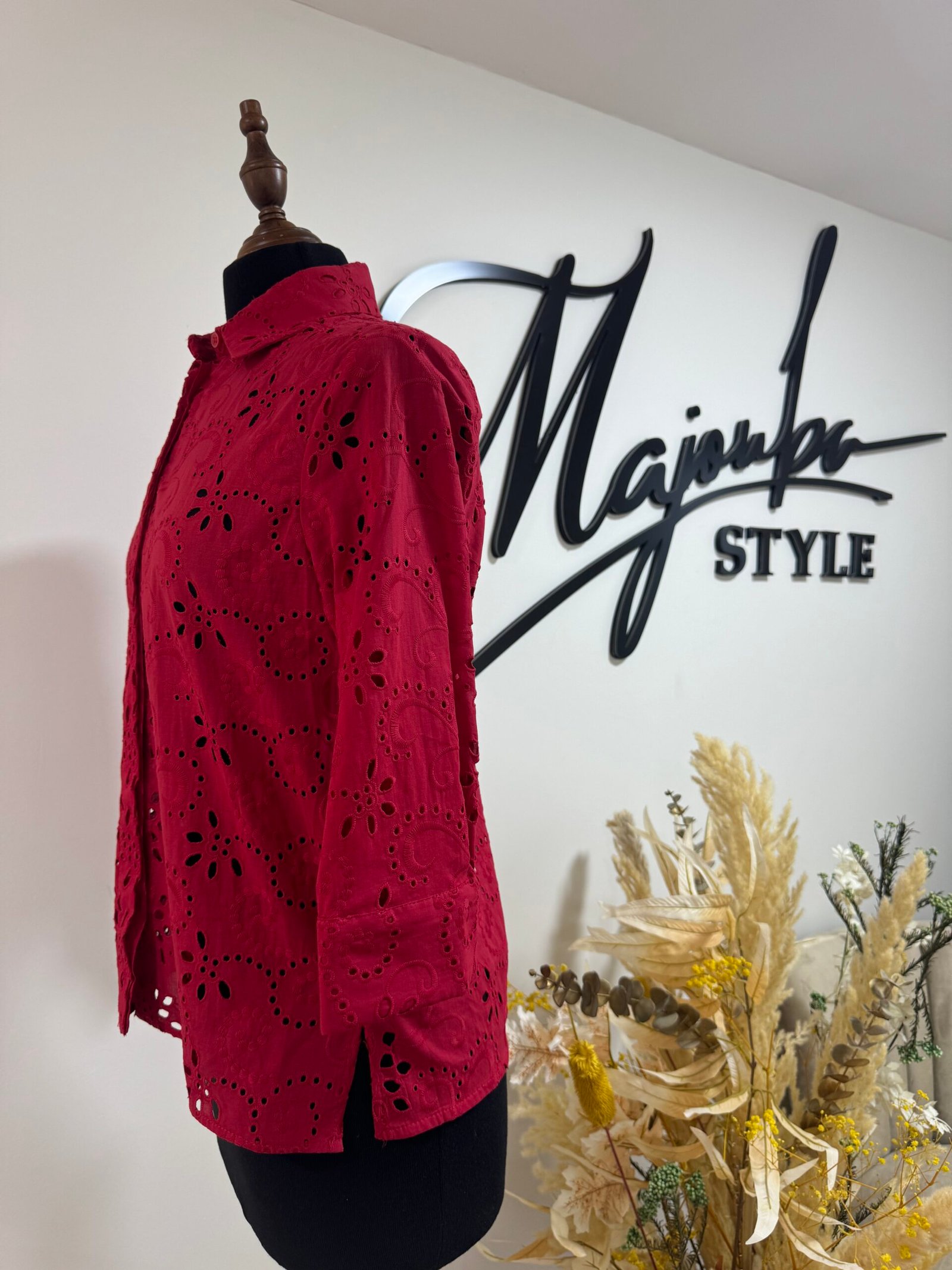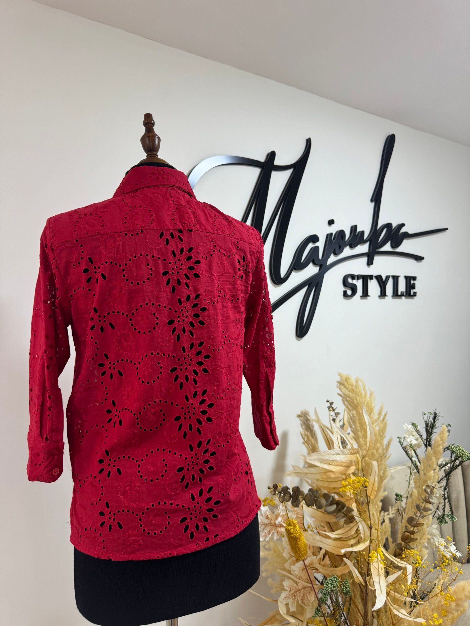Chemise rouge brodée, raffinée et pleine de détails délicats. Une pièce chic qui allie élégance et originalité pour sublimer ton style en toute occasion.