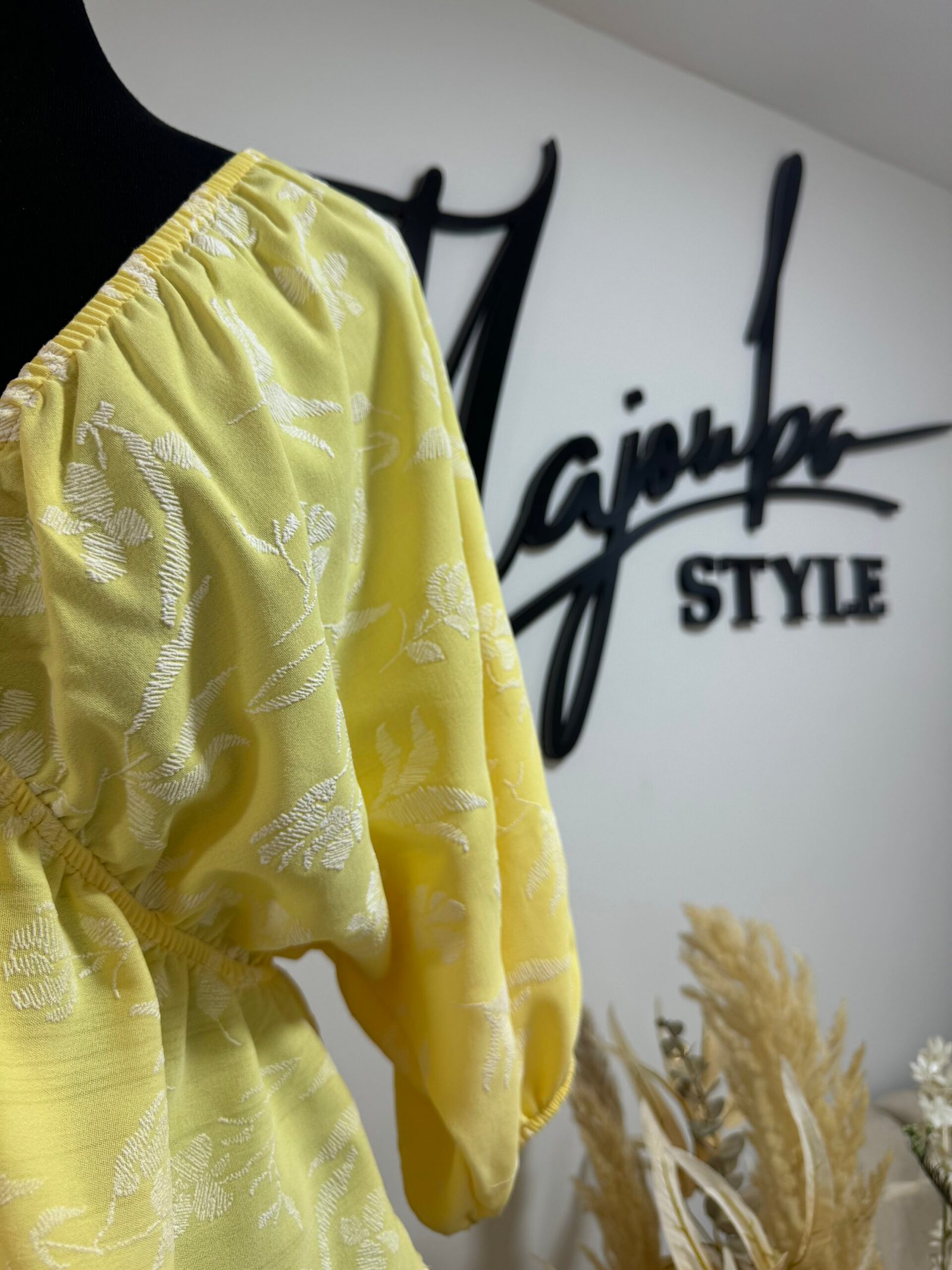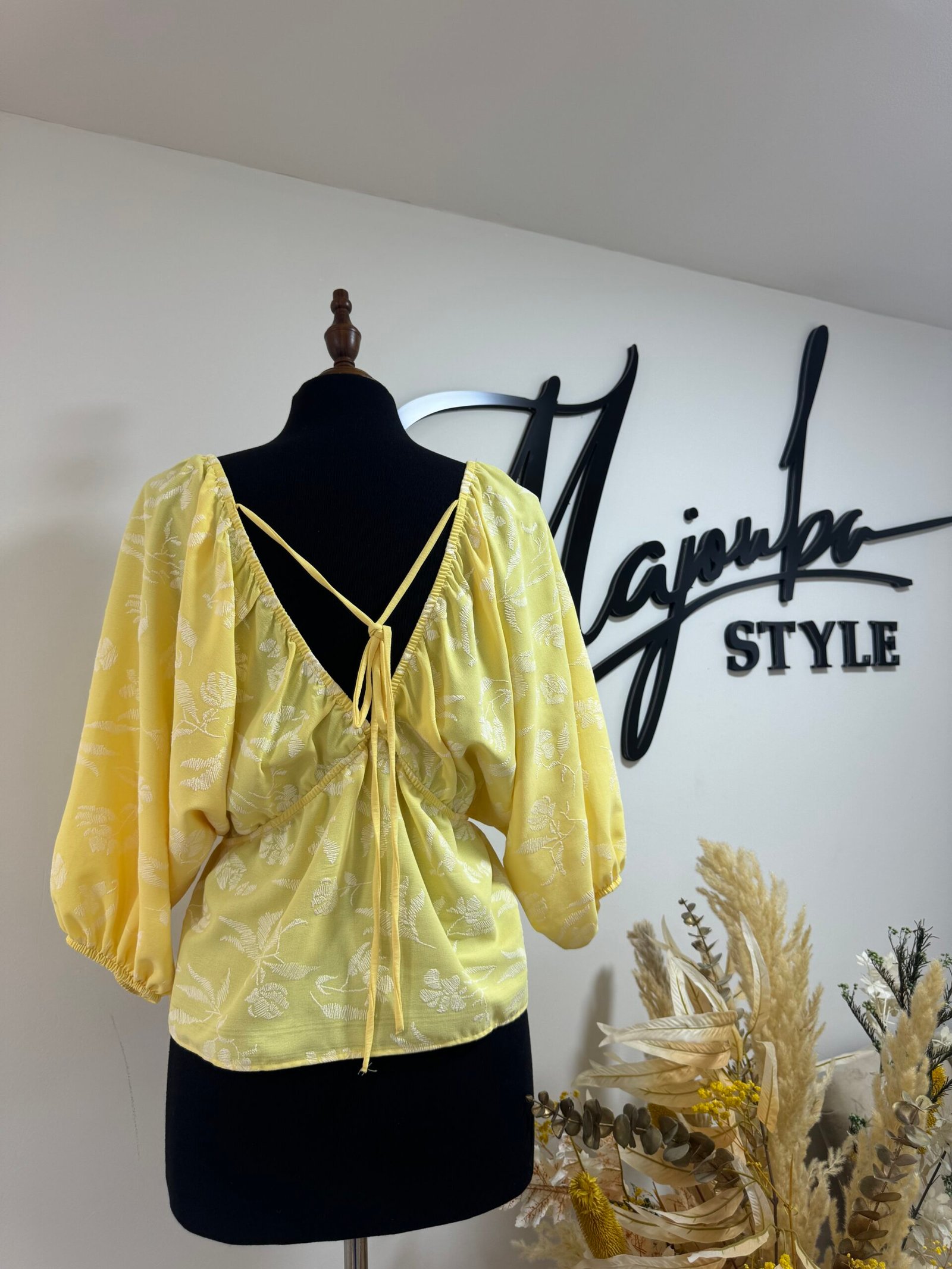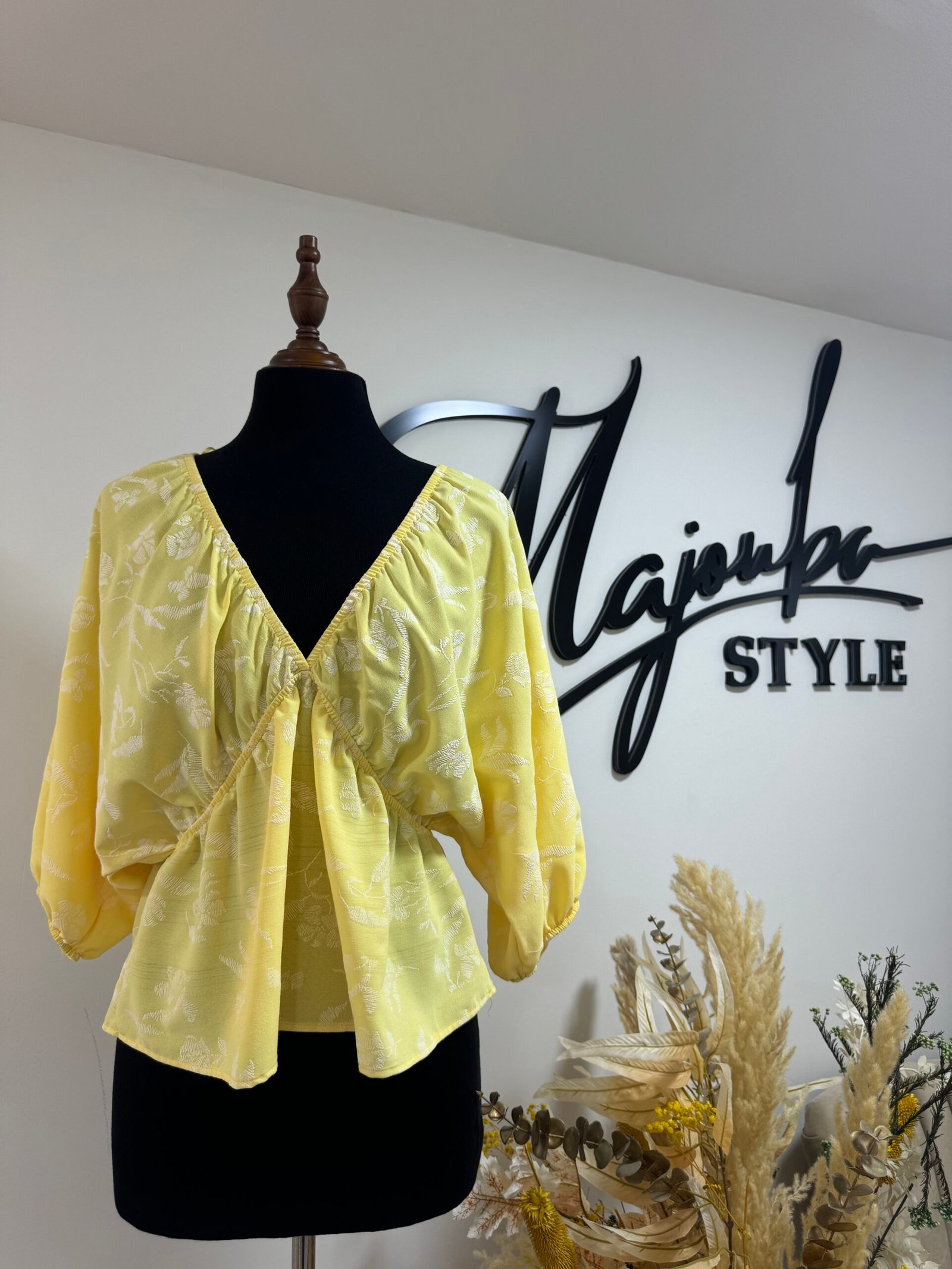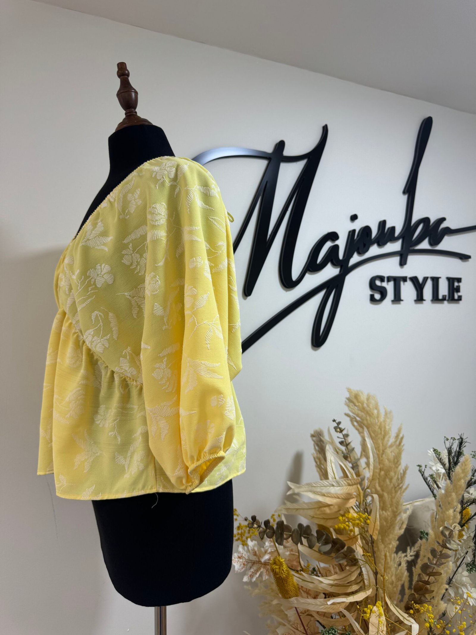 Ce haut à motifs floraux dans une teinte jaune est l’incarnation parfaite du chic estival. Léger, fluide, et ultra féminin avec sa coupe croisée et ses manches bouffantes