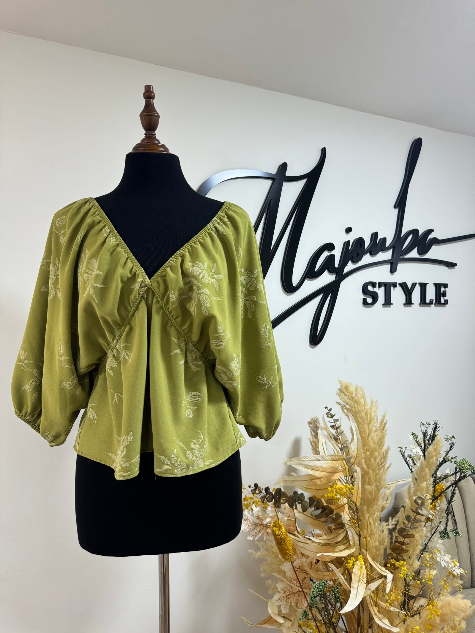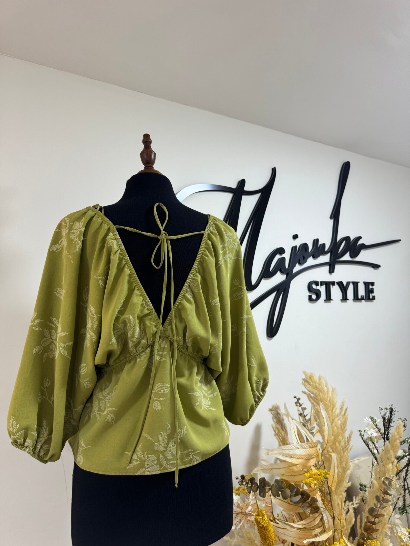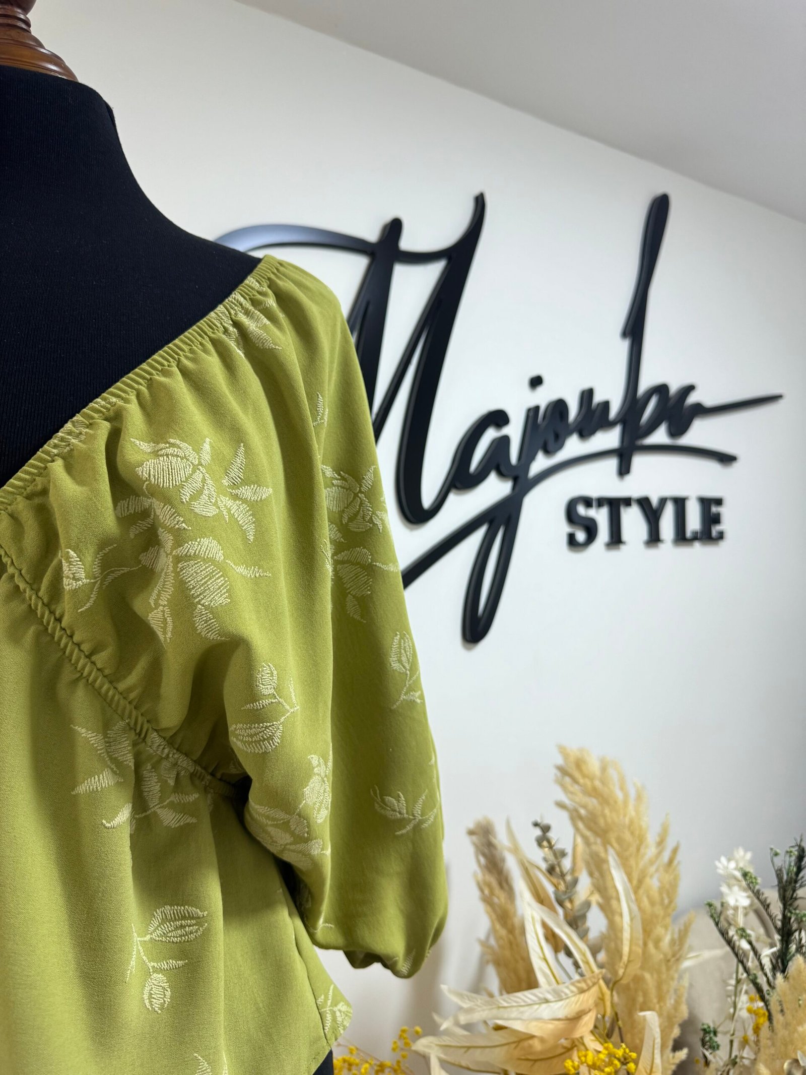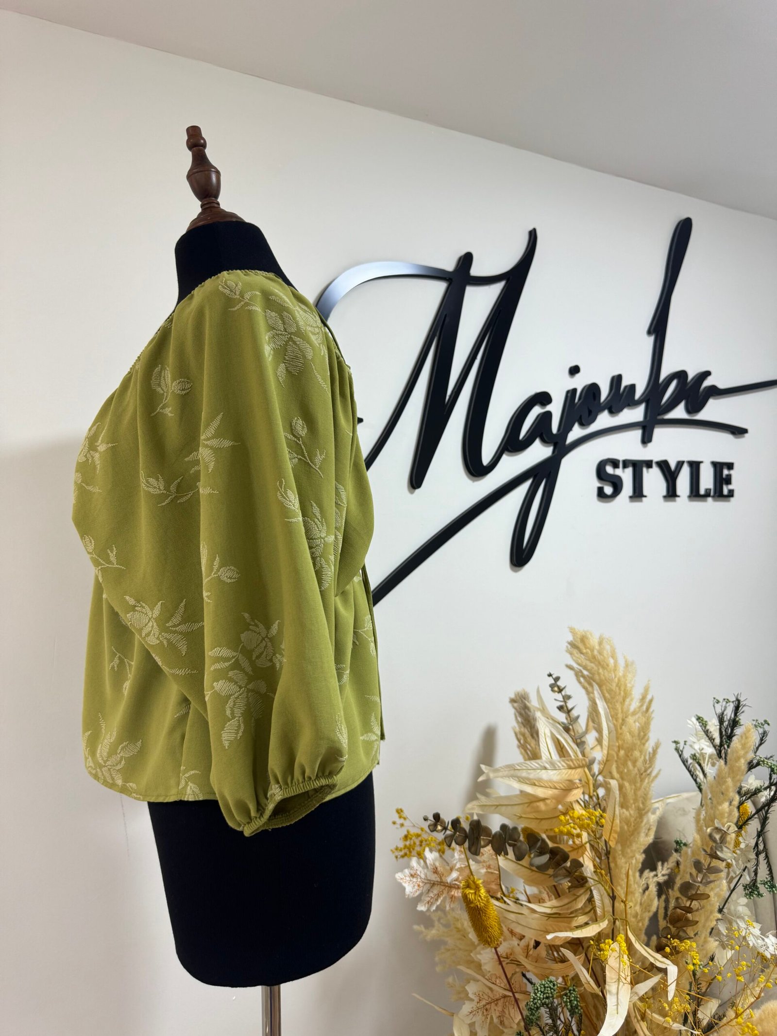 Ce haut à motifs floraux dans une teinte vert olive est l’incarnation parfaite du chic estival. Léger, fluide, et ultra féminin avec sa coupe croisée et ses manches bouffantes