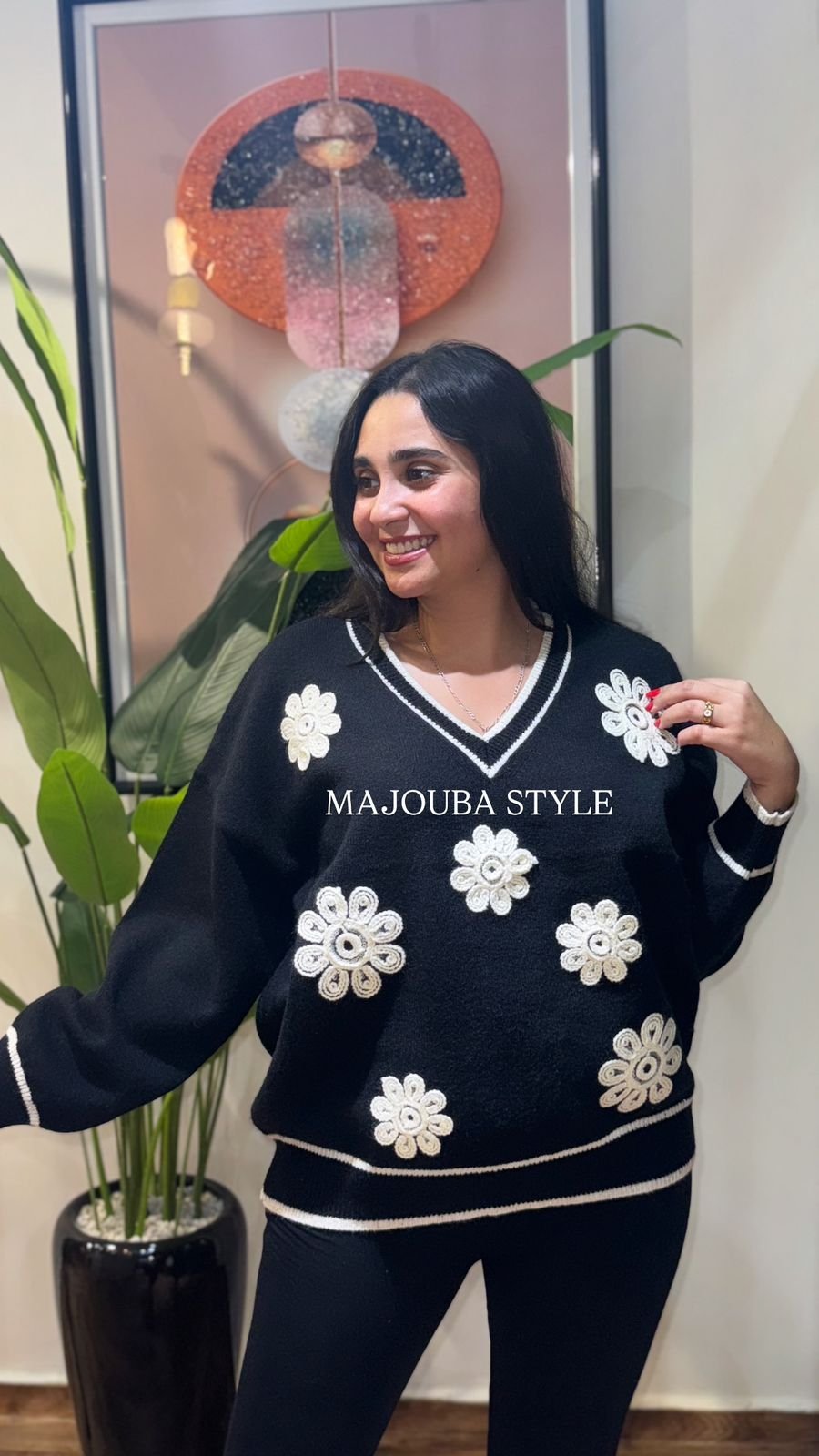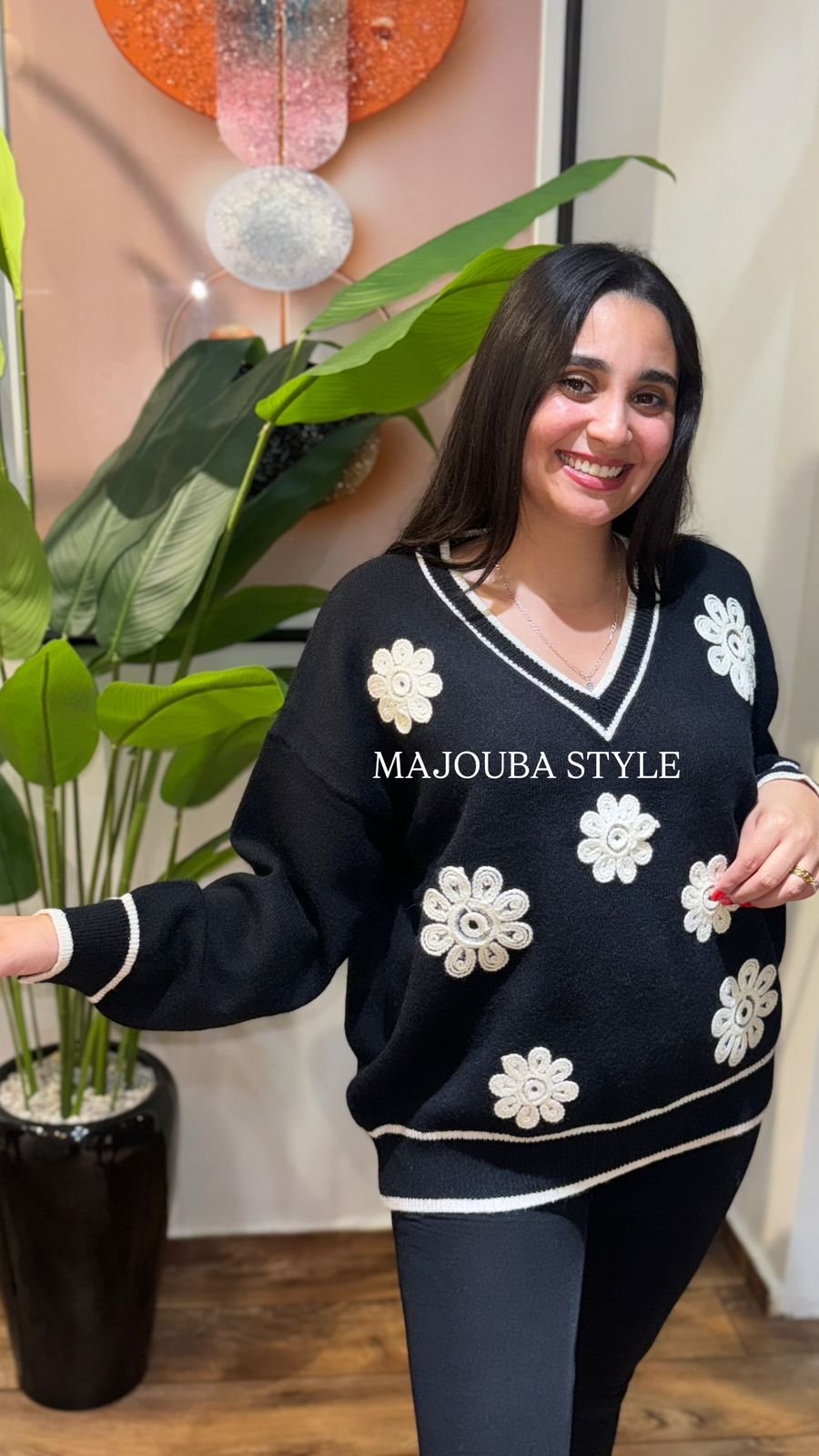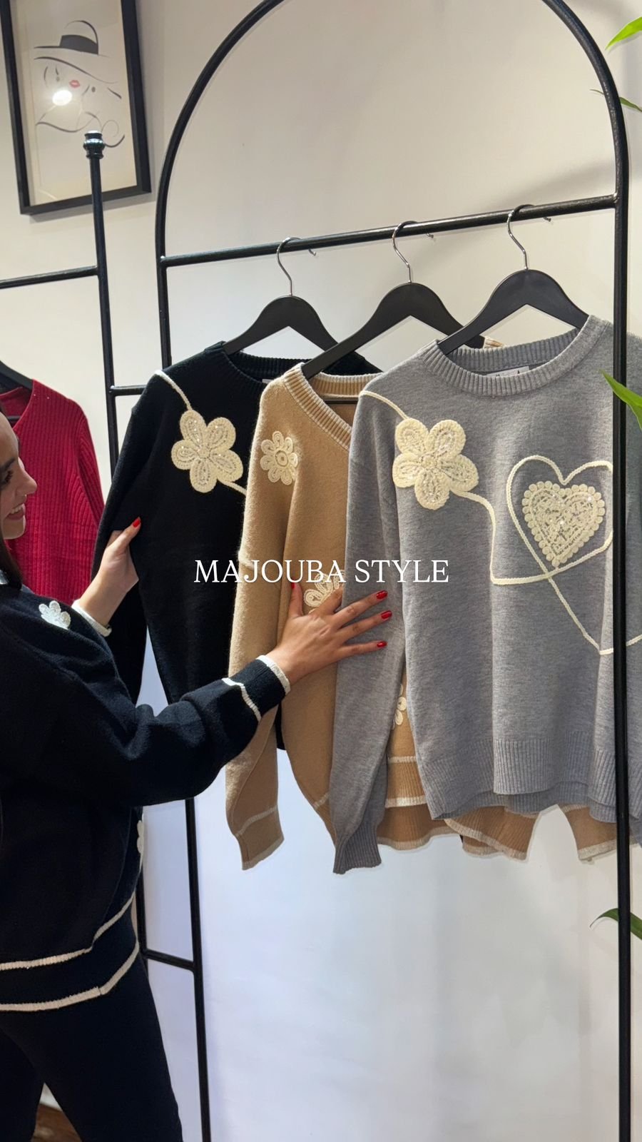 Nouveau pull coup de cœur🌼 Un design unique avec ses fleurs brodées, doux et tendance 💫 Facile à porter, il apporte une touche chic à ton look d’automne 🍂