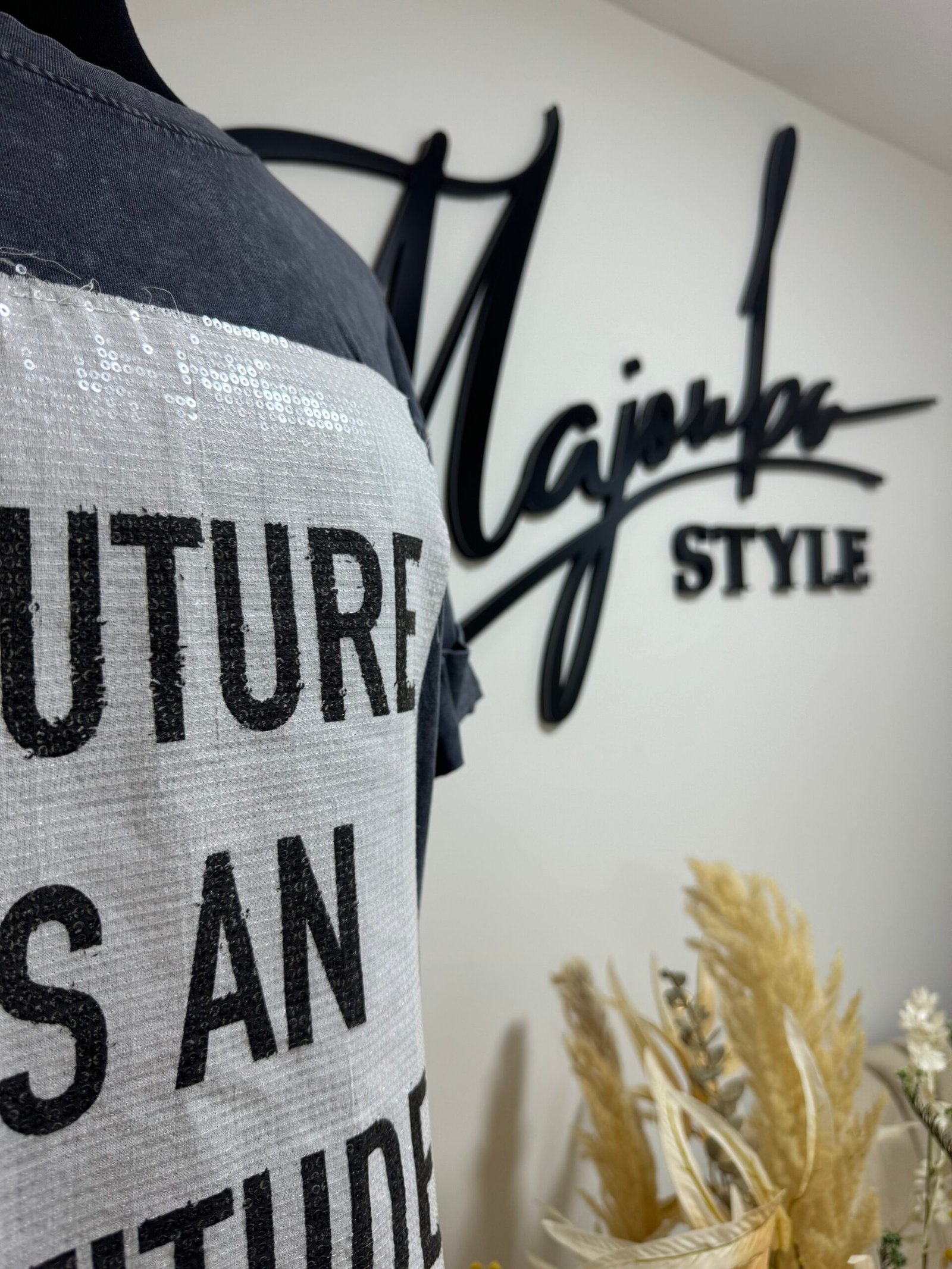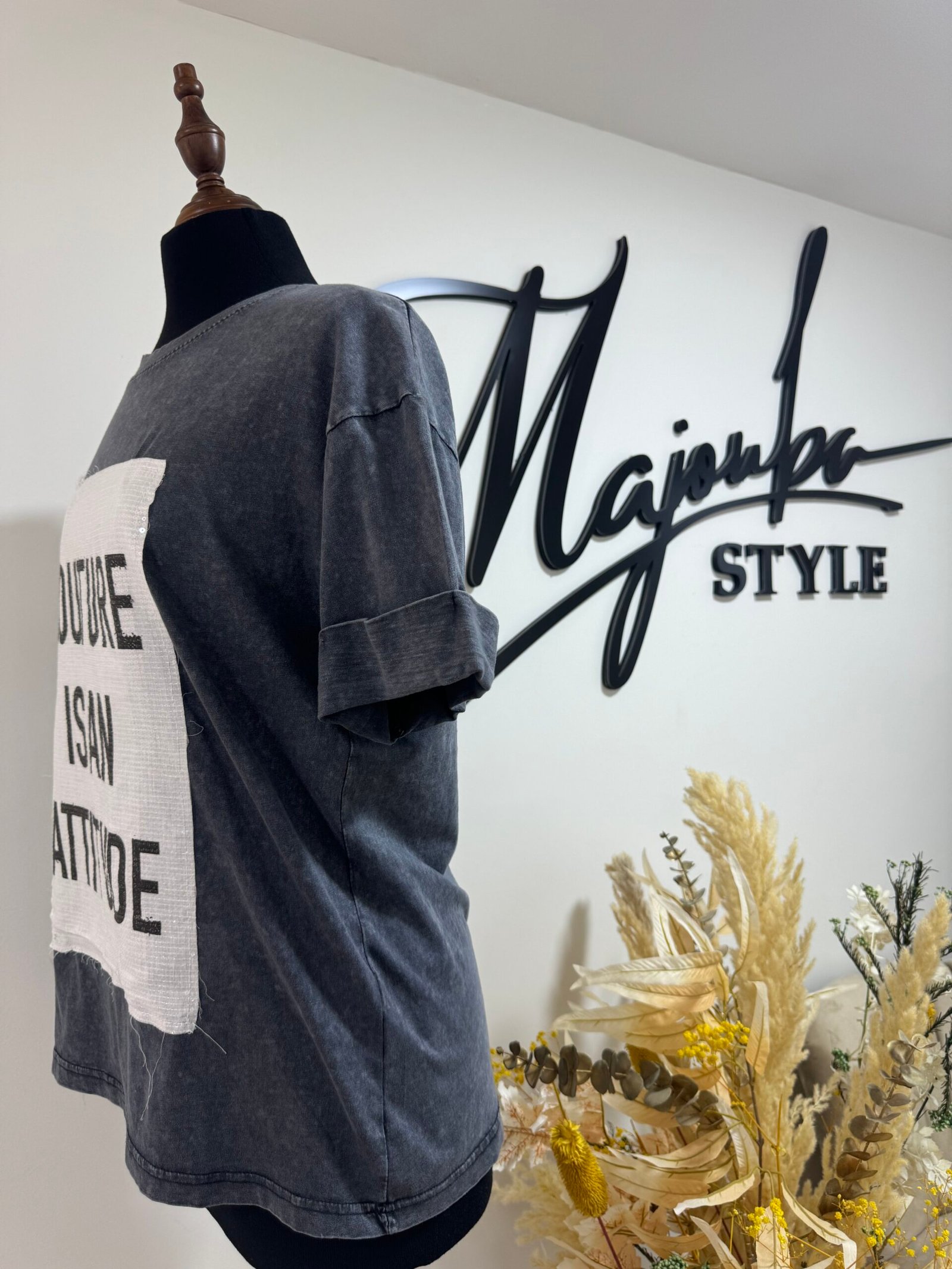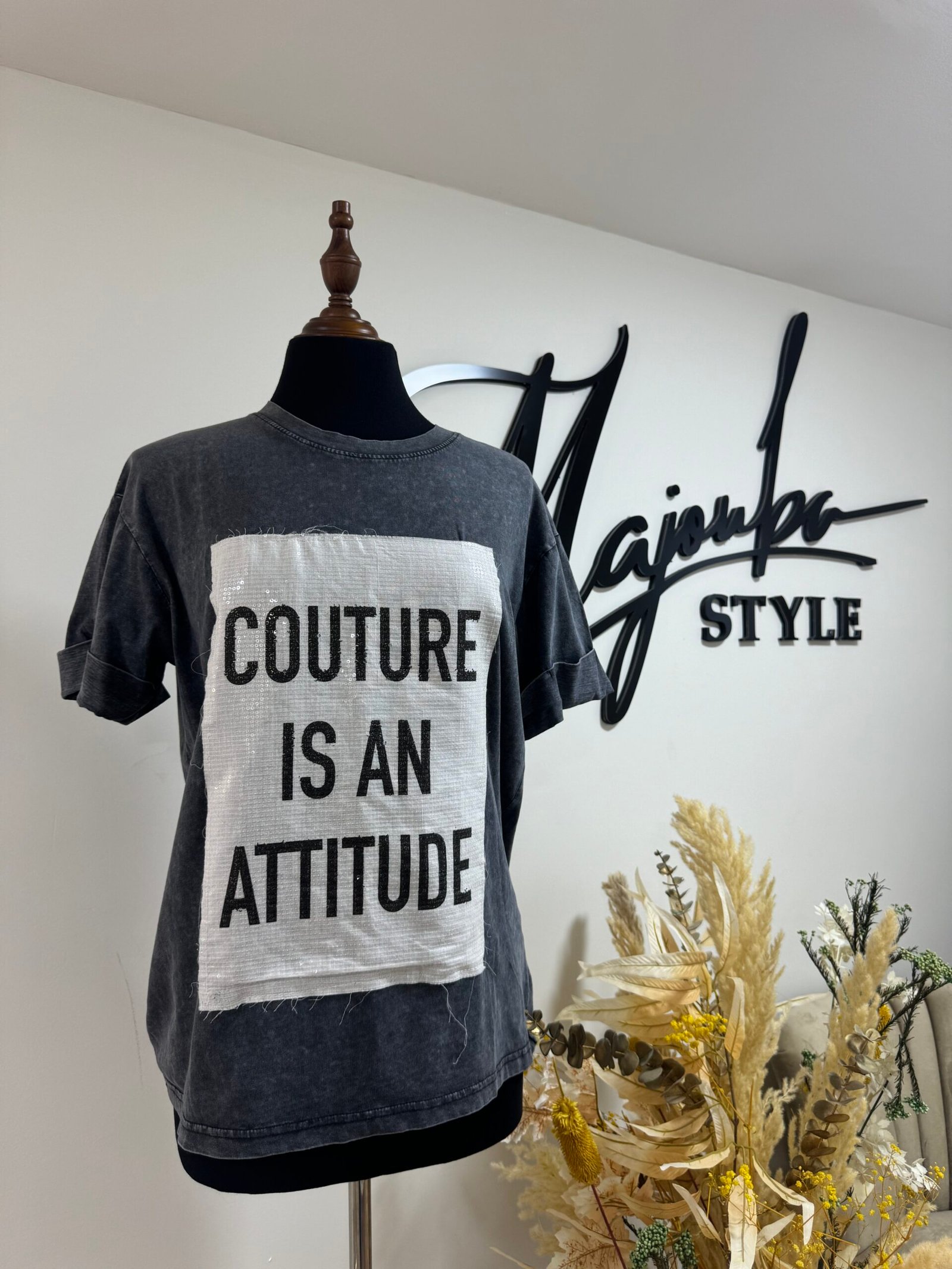 Haut tendance avec détail brodé à l’avant, portant l’inscription “Couture in an Attitude”. Une pièce moderne et stylée qui allie confort et caractère pour affirmer ton look au quotidien.