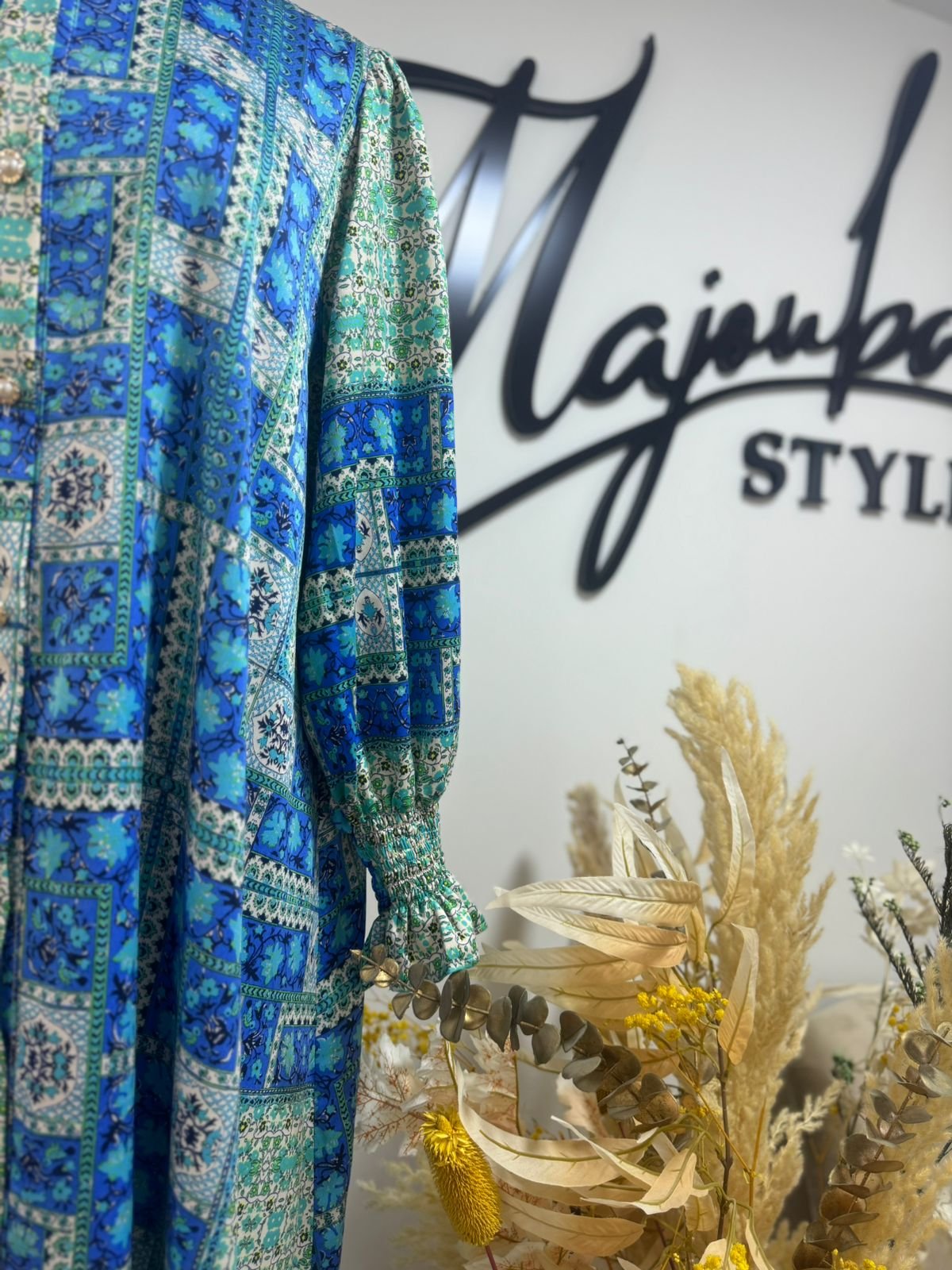 Craquez pour cette robe chemise longue aux imprimés baroques et couleurs fraîches 💚💙